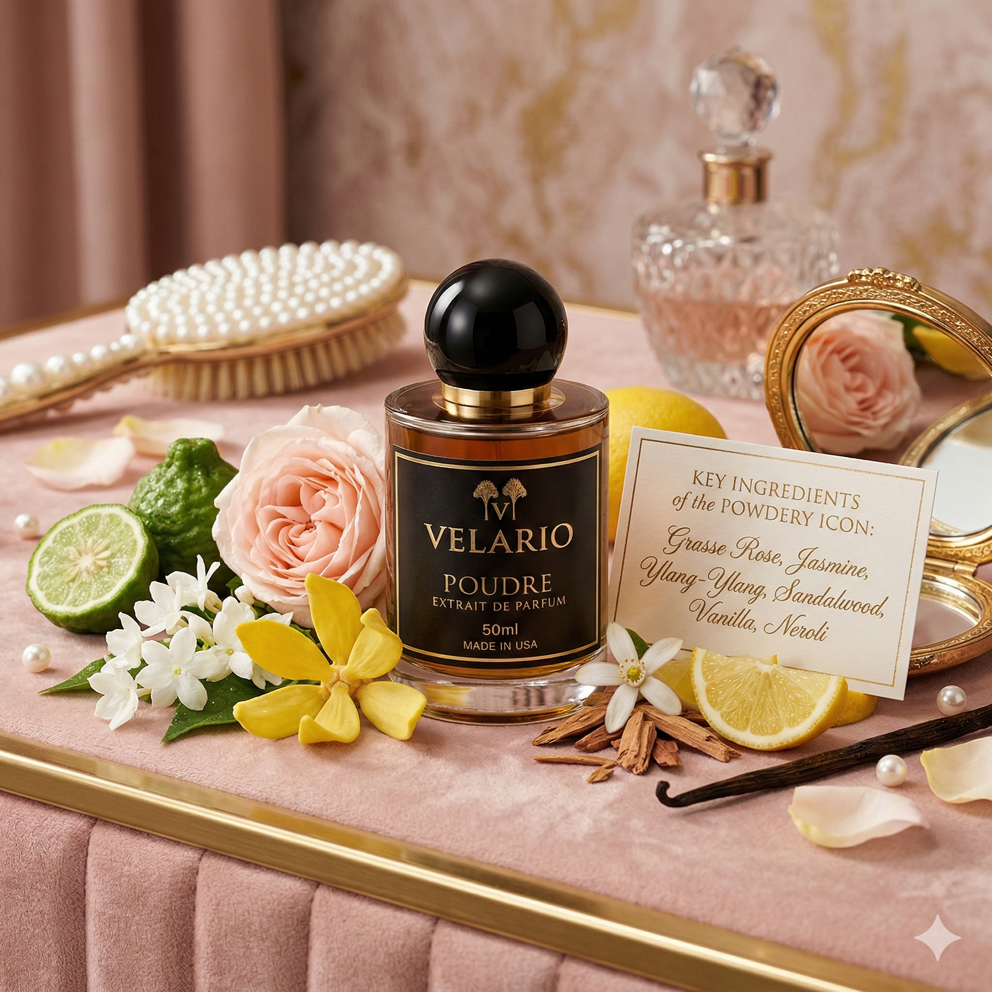 Velario Poudre is a timeless, elegant extrait de parfum inspired by iconic aldehydic floral luxury fragrance profiles. It opens with bright, airy aldehydes, blossoms into a refined bouquet of rose and jasmine, and settles into a soft, powdery vanilla-musk base that feels effortlessly sophisticated.